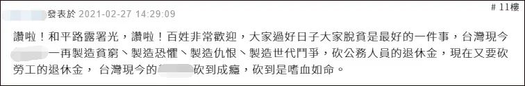 当然,也有台湾网友对《规划》表示“欢迎”,认为这样能让“大家过好日子、脱贫是最好的一件事”,“台当局一再制造贫穷、制造恐慌、制造仇恨、制造世代斗争,砍公务人员的退休金,现在又要砍劳工的退休金,台当局砍到成瘾,砍到嗜血如命。”