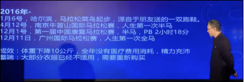 从2016年接触跑步开始,那1年内他体重下降了10公斤。从83公斤到了73公斤,脂肪肝也有所好转,没有任何的饮食控制,那一年他64岁。