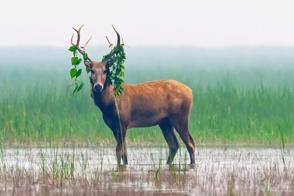 麋鹿亦称“四不像”,角似鹿非鹿,脸似马非马,蹄似牛非牛,尾似驴非驴,是最奇特的鹿科动物,为尘世里中原所独有的珍稀动物。麋鹿喜欢栖息在沼泽之中,其犄角朝后和向外生长,有利于缠绕长水草;尾巴似驴长至脚踝,有利于驱赶沼泽蚊蝇虻虫;蹄子如牛蹄般宽大且有鸭蹼状瓣膜,在泥沼中行走不易下陷;倒梯形的马脸鼻唇宽大,生有长而硬的刚毛,便于将整个头部伸进水中取食水草,唇部触毛起到探知感觉的作用。