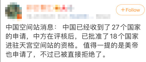 中国空间站截止目前已经收到来自27个国家的申请,其中有18个国家被批准进驻天宫空间站。值得一提的事情,美国也申请了......近日,中国网友迎来一个快乐无比的大消息,根据网络热搜话题#中国空间站拒绝美国加入#显示,长期被人们称为“航天大国”的美国,居然也会来求着加入天宫空间站,而且在大部分国家都通关的背景下,美国却被惨痛的刷下来了。