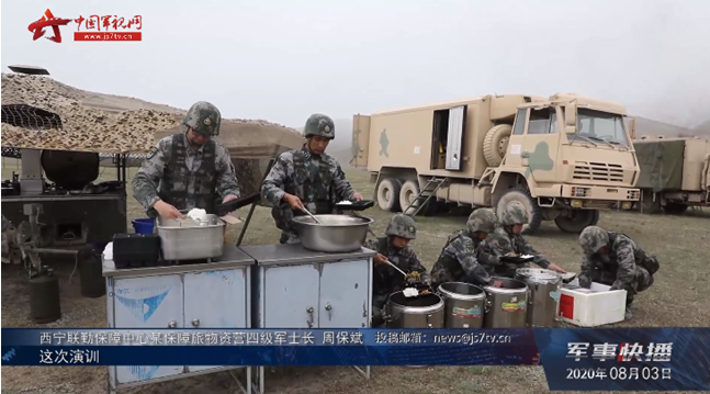 西宁联勤保障中心某保障旅物资营接到命令后,迅速派出8名炊事员,并启用多台野战炊事车,炊事员密切配合,在80分钟内完成300人次的热食制作。