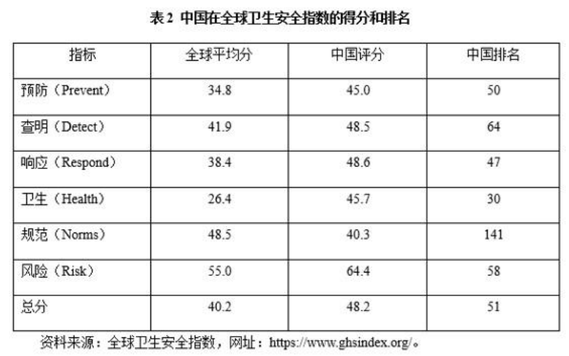 在这个卫生安全指数里中国各项指数都偏低,总分仅48.2分,全球排名51位,“响应”排名47位,“规范”排名141位,有50个国家综合指数在中国之前。