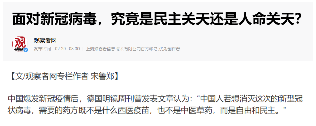 新冠疫情爆发之后,西方媒体立刻跳出来对我国社会主义制度进行狂风暴雨般的攻击。