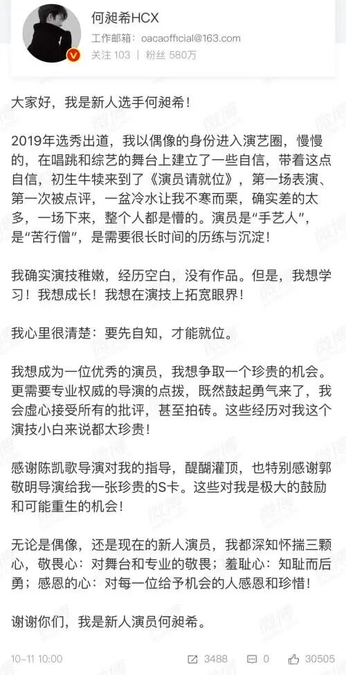 10月11日上午,处于舆论中心的新人演员何昶希发表微博回应:“我确实演技稚嫩,经历空白,没有作品。”“感谢陈凯歌导演对我的指导,醍醐灌顶,也特别感谢郭敬明导演给我一张珍贵的S级卡。”