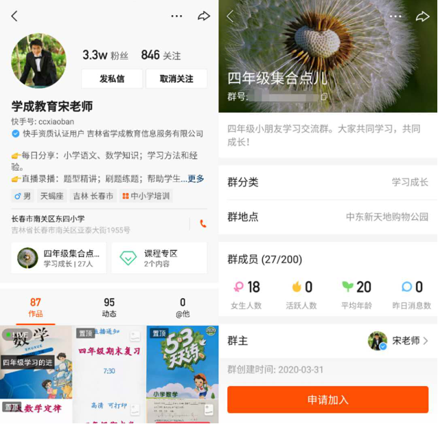 雷锋网还发现,有些老师在个人主页上开设了自己的学习社群,而且无需导到其他社交平台,直接在快手里就可以做社群运营。也就是说,教育创作者们,在快手上即可完成获客、运营和交付的完整生态。