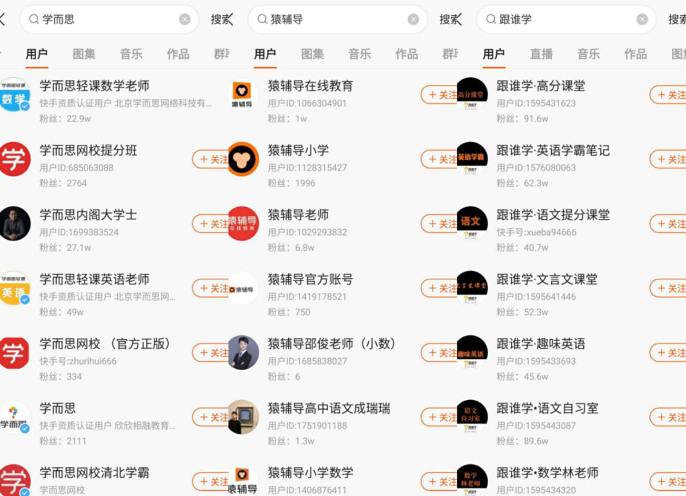 在平台的大力扶持下,快手的教育供给日益多样化,涉及K12、素质教育、职业教育等多个领域。以K12领域为例,学而思、猿辅导、跟谁学、洋葱数学、作业帮等公司纷纷入驻快手,并建立了一系列快手账号矩阵。
