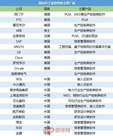 为了能更直观地阐述国内外工业软件及主要厂商,雷锋网特地对这一领域的企业、所属国家和主要产品作了汇总,详见下图: