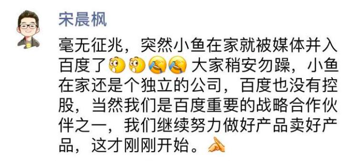 小鱼在家创始人兼CEO宋晨枫也发朋友圈称,“小鱼在家仍是独立公司,百度没有控股,我们是百度重要的战略合作伙伴之一。”
