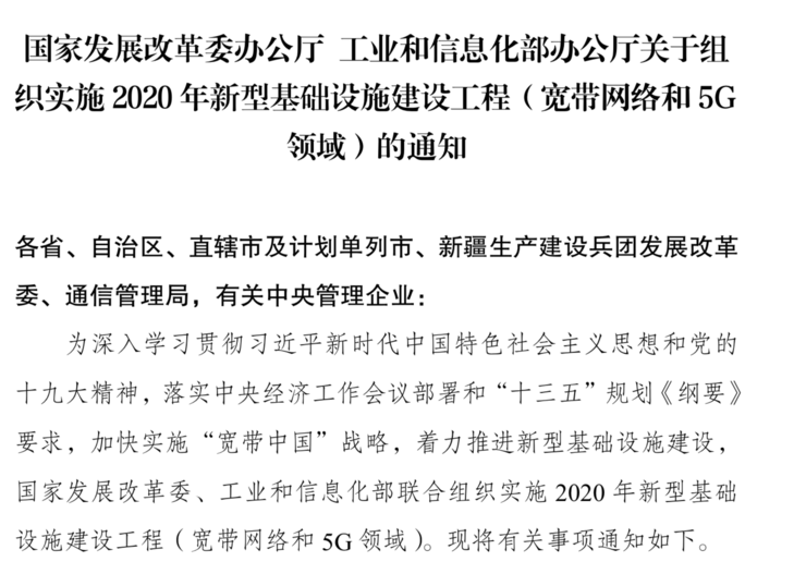 日前发改委和工信部下发《关于组织实施2020年新型基础设施建设工程(宽带网络和5G领域)》的通知,则更加凸显新基建对5G的促进作用。《通知》下发了七项5G创新应用提升工程的申报通知,文件中明确写道: