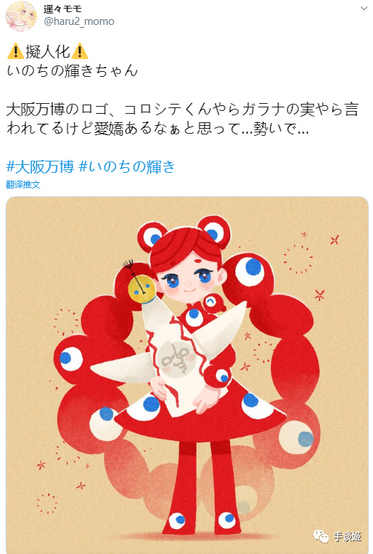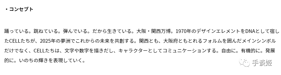 按设计师的说法,这个红色的生物是由多个细胞构成的,部分灵感(眼睛那块)源于1970年的大阪世博会会徽。然后整个会徽象征着跃动、有机、自由、发展,表现了“命の輝き”,生命的光辉。