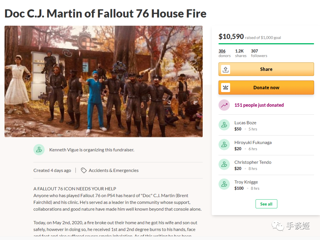 得知CJ Martin这名角色背后的玩家Fairchild的悲惨遭遇,《辐射76》的视频制作者Kenneth Vigue在众筹网站GoFundMe发起了呼吁,号召玩家帮助“医生”渡过难关。