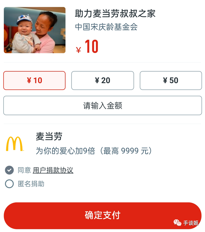 你可以直接捐助一些现金,麦当劳会给个超级加倍,捐你捐助金额的9倍。