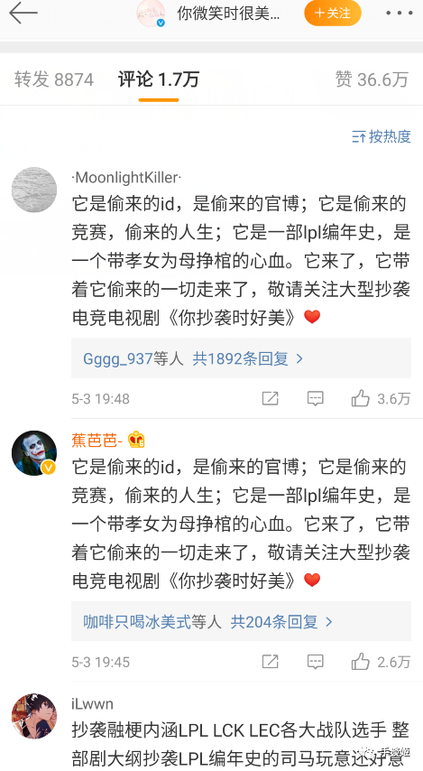 本来以为只是人设融合了LPL的多位选手,网友们挖掘以后才发现这部《你微笑时很美》除了人设是在LPL取的材,其他东西也是直接照搬LPL。