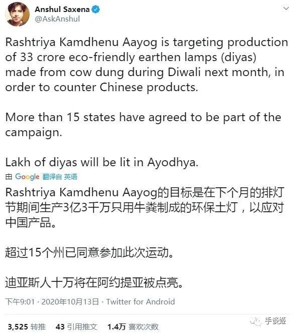 顺带一提,除了牛粪芯片,印度全国牛类委员会还在大力推广其他牛粪制造的产品,比如土灯,神像,蜡烛,香炉等。并且委员会还提出要用国产牛粪产品代替中国制造。