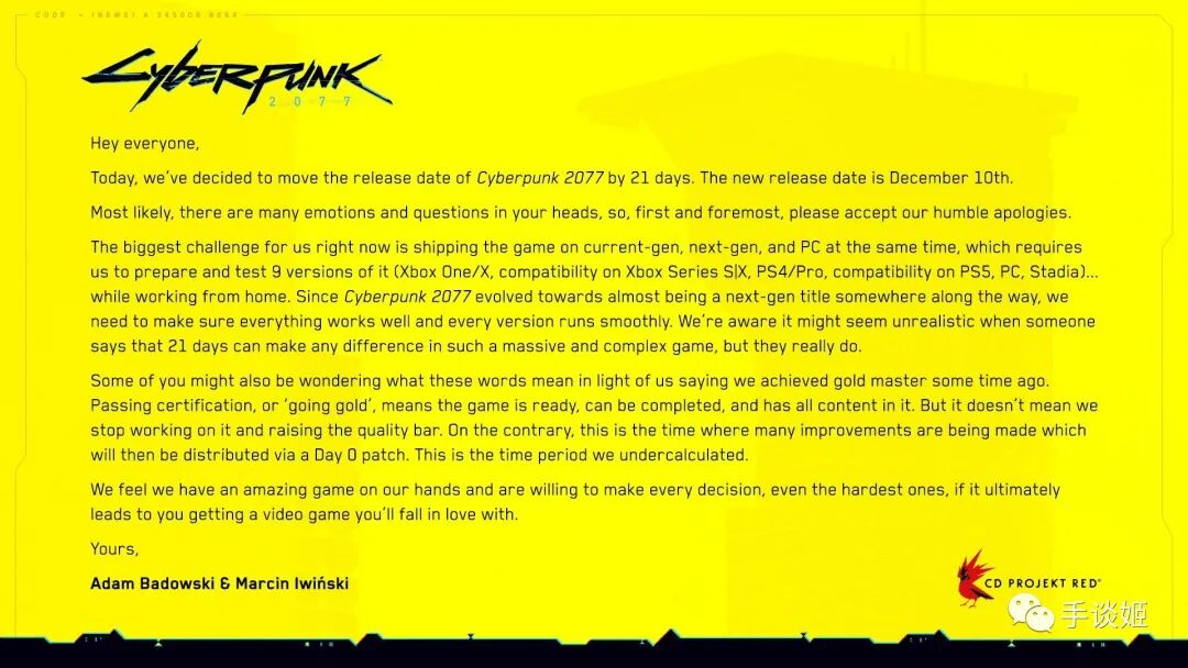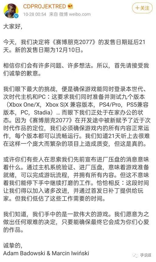不久之后,波兰蠢驴在微博也发布了中文通告版本。大致是说游戏跳票是因为要测试的版本太多了,远程办公效率又没那么高,请谅解巴拉巴拉。