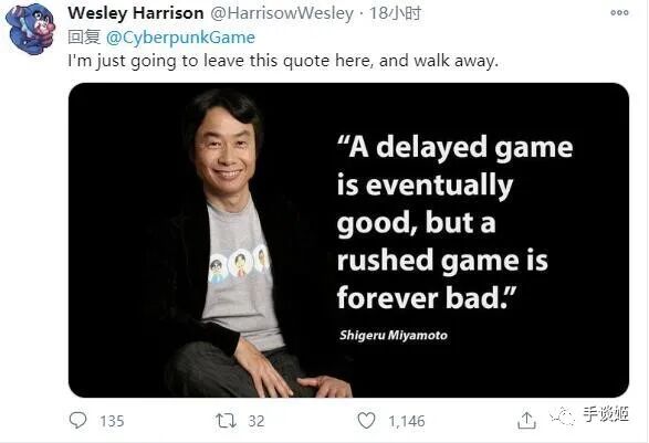 (图上是任天堂注明制作人宫本茂,写着“一个延期的游戏终究是好的,而一个赶工的游戏肯定不行。”算是安慰自己吧)
