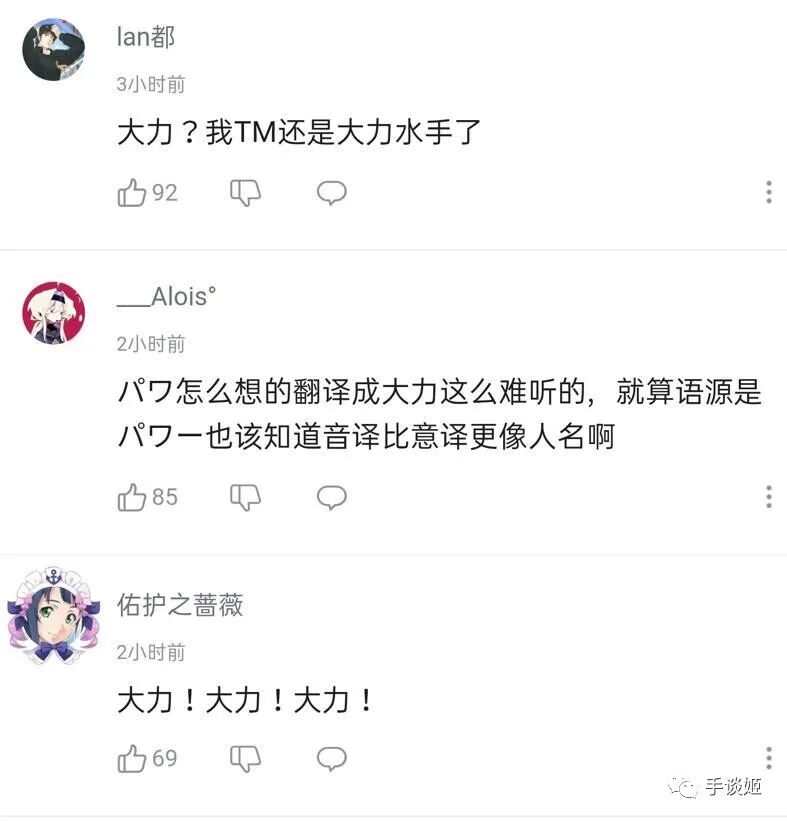 虽然power是有这方面的意思吧,但给个妹子叫大力总觉得很诡异。哪怕妹子性格确实奔放到不正常,可喜欢猫就证明还有柔和的一面。想意译的话,姬寻思翻译成“力量”也比较正常吧。