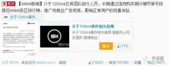 2014年7月18日,b站官方微博发布公告,称12dora以及12team的部分人员,长期购买硬币刷分,操作b站排行榜,推广商业视频,影响用户观看体验。官方与其交涉失败还被威胁,于是决定封禁12的账号,永久禁止访问。