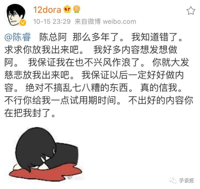 离开b站数年后,12dora也越来越知道自己离不开平台,接受社会毒打后,当年的傲气不复存在,不断恳求现在的b站老大陈睿放自己一马。