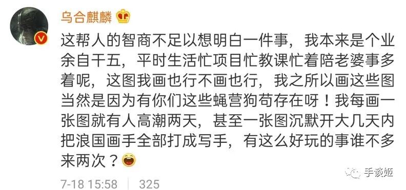 当然,姬的理解和看法可能也是偏激的。前面姬就说了,不知道乌合麒麟和一些画手到底发生了什么冲突,让他们如此愤怒。姬友们如果身在圈内,手握什么决定性证据能证明乌合麒麟歪屁股,那姬无话可说,会给你评论置顶一下。只是就目前在知乎和豆瓣和微博围观后,姬觉得这位画师值得关注。