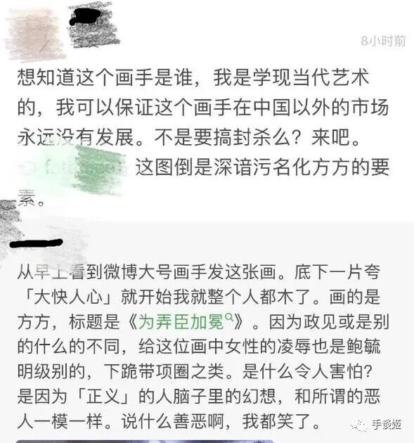 比如看到《为弄臣加冕》这张图,有人高喊这是对女性的凌辱,说这是污名化方方,说要人肉、封杀和抵制乌合麒麟。