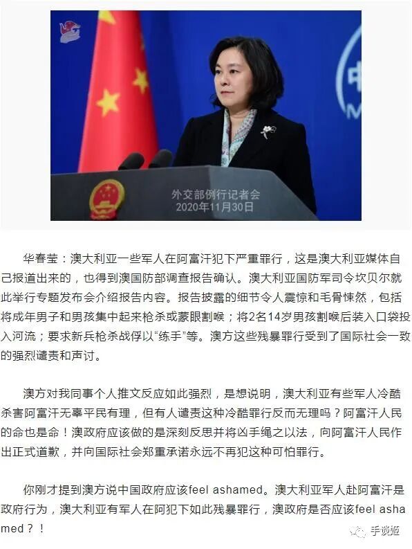 外交部发言人华春莹:澳大利亚政府才应该feel ashamed。