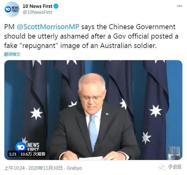 然后他说中国政府应该对这张假图感到羞耻,并传唤了中国驻澳大使。