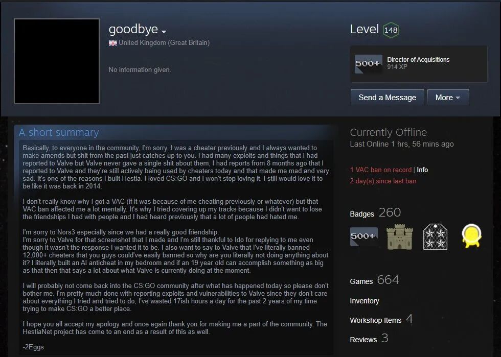 大概又过了几个小时,2Eggs在Steam社区发布长文公开道歉,宣布永久退出《CS:GO》圈并停止更新反作弊工具。