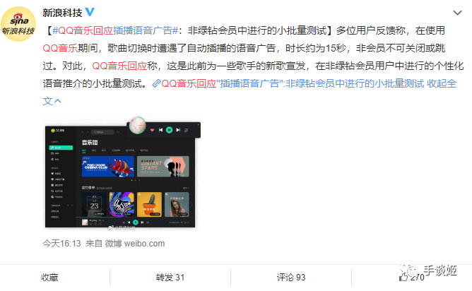 网上有人传说这次QQ音乐的新广告不管是会员还是非会员都不可关闭不能跳过,但QQ音乐官方已经对此作出了辟谣,确认这次插播广告是只在非绿钻会员中进行的小批量测试,并且插播的是歌手新歌的宣发广告。