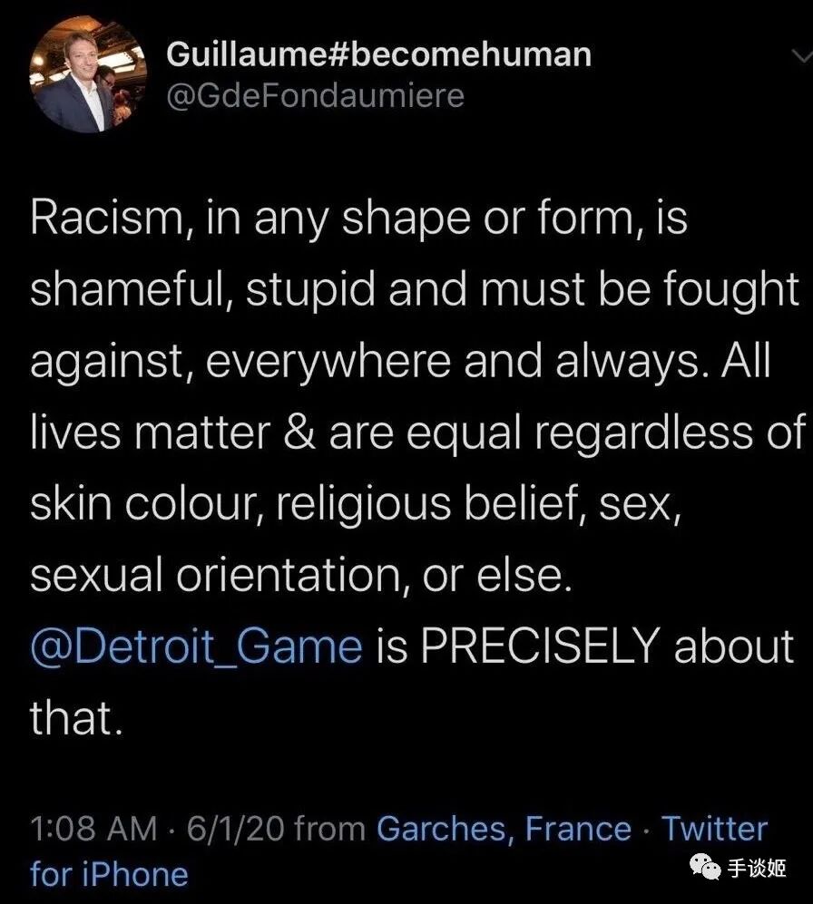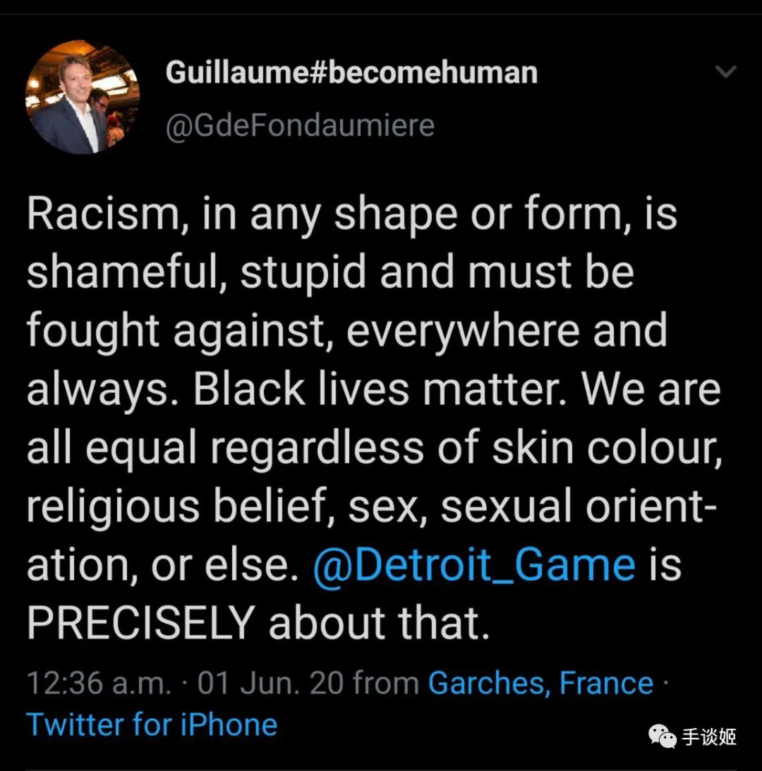 如果有玩过或者云过《底特律:变人》的姬友一定知道这款游戏的内核即是“仿生人追求自由”,讨论有关平等的话题时引用十分合适,但Guillaume的言论在网友们看来十分扎眼,认为他只是在“蹭热度”,借机宣传自家游戏。