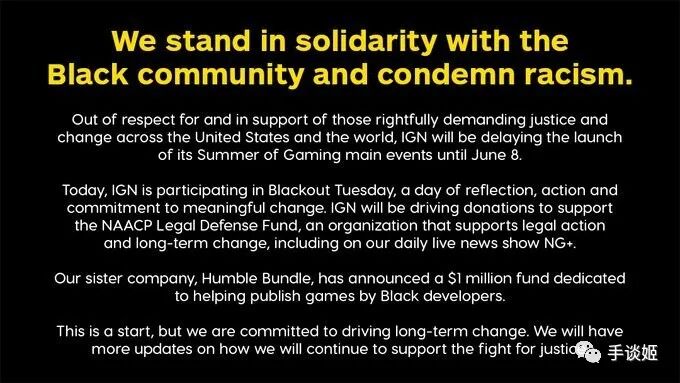 IGN在6月3日停更一天,并将“游戏之夏”活动延后到6月8日举办,旗下的Humble Bundle捐出100万美元;