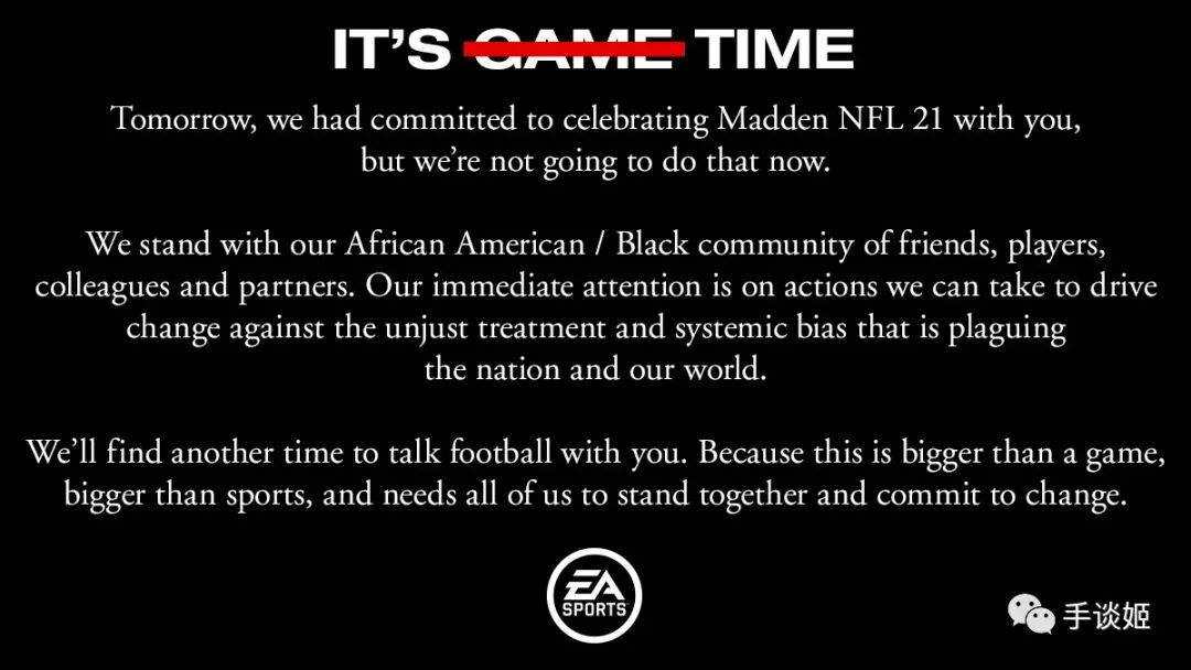 EA取消《麦登橄榄球21》的活动计划,为了“所有人站在一起,致力于改变”;