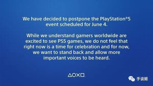 索尼原定于6月4日的PS5游戏展示活动宣布无限期推迟,以此“让更重要的声音被大众听到”;
