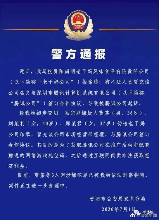 贵阳的警察蜀黍效率极高,给出了通报。然而这通报让所有人大跌眼镜——竟是3人伪造老干妈公章,冒充老干妈工作人员和企鹅签了协定。
