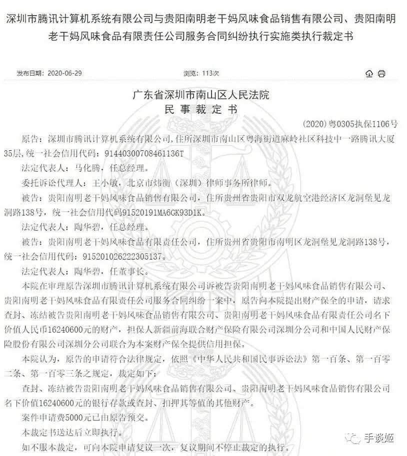 昨天,腾讯与老干妈的官司引起轩然大波——腾讯向南山法院起诉老干妈,请求冻结、查封其1600多万元的财产,理由为服务合同纠纷。