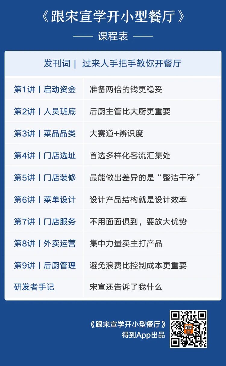 想了解更多关于小型餐厅如何选址,门店装修,门店服务,外卖服务等问题,欢迎查看《跟宋宣学开小型餐厅》。