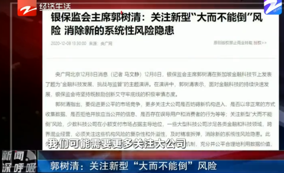 银保监会主席郭树清点名大型科技公司“大而不能倒”风险,再次给互联网巨头敲响警钟:从今往后,互联网平台的发展将会受到全方位管控,特别是在金融领域,哪怕你规模大到不能倒的程度,一旦达不到监管要求,或是发生系统性风险,照样追责到底,直至破产倒闭!