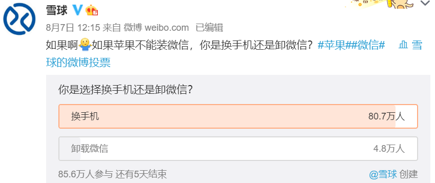 这意味着,届时用户不得不在“有iPhone无微信”和“换手机用微信”之间二选一,这两天不少媒体做的投票都给出了一边倒的结果:9成以上用户都选择站在微信这边。