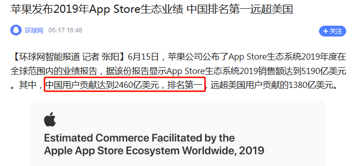 苹果在6月份公布了2019年的APP store生态业绩,中国用户贡献2460亿美元高居全球第一,远超第二美国的1380亿美元,全球占比高达47.4%。如今随着特朗普禁令的下达,这块最大的蛋糕能保住多少,库克心里都没底,只能先尽可能稳住中国用户。