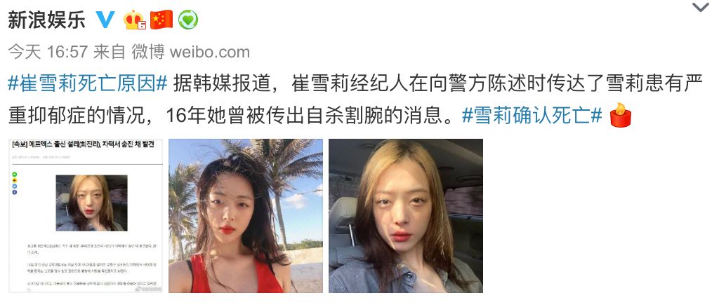昨天我们写的崔雪莉也是在众人极度震惊中自杀身亡的,在去世之前甚至还非常正常的拍广告。