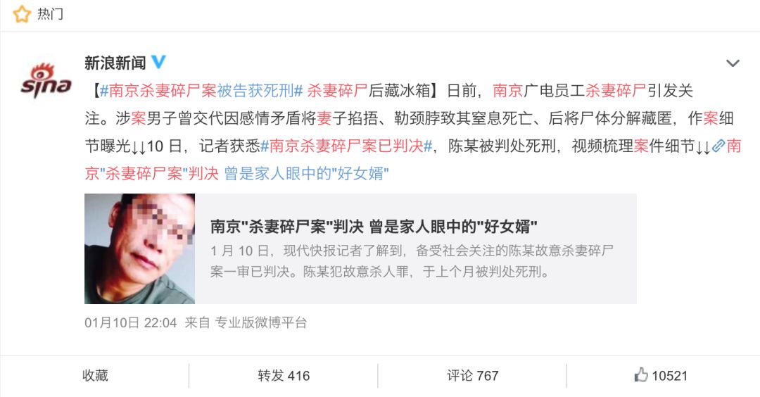 昨天1月10日,备受社会关注的陈某故意杀妻碎尸案一审已判决,陈某犯故意杀人罪,于上个月被判处死刑。