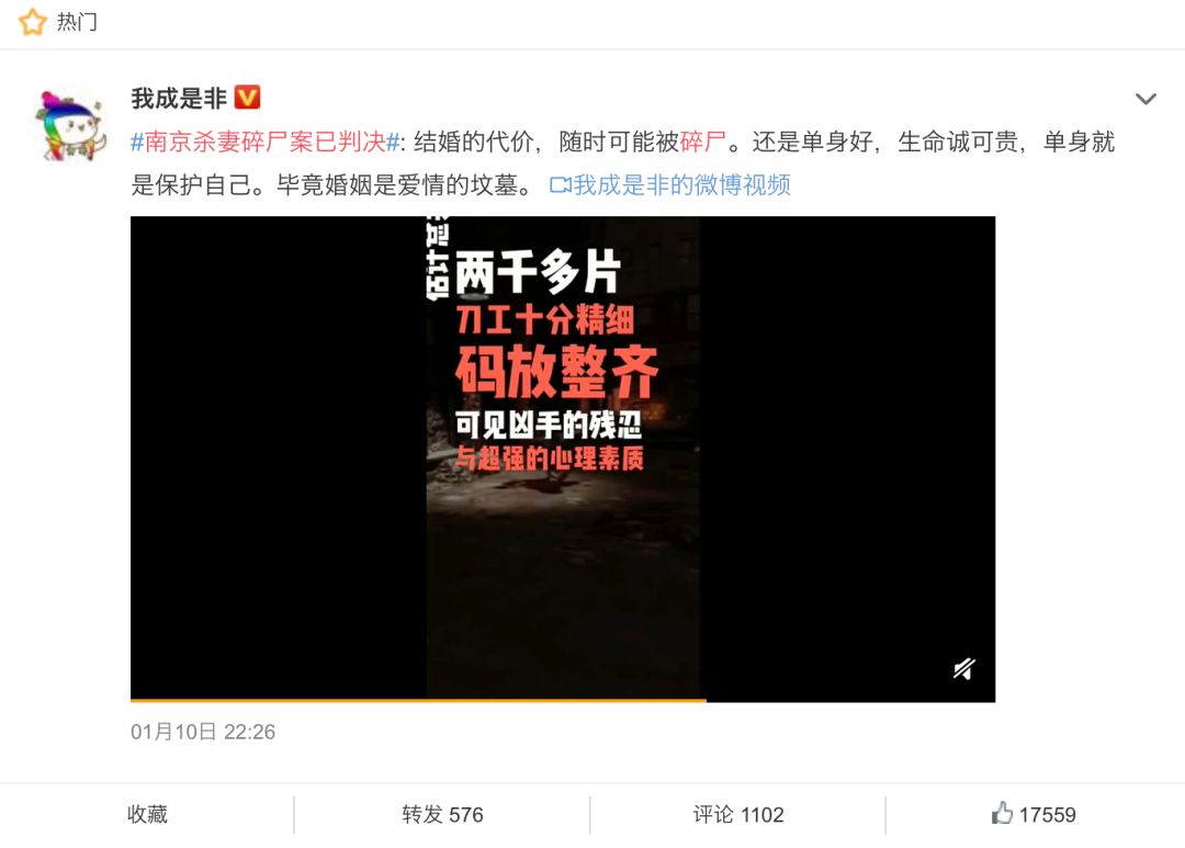 “结婚的代价,随时可能被碎尸。还是单身好,生命诚可贵,单身就是保护自己。毕竟婚姻是爱情的坟墓。”