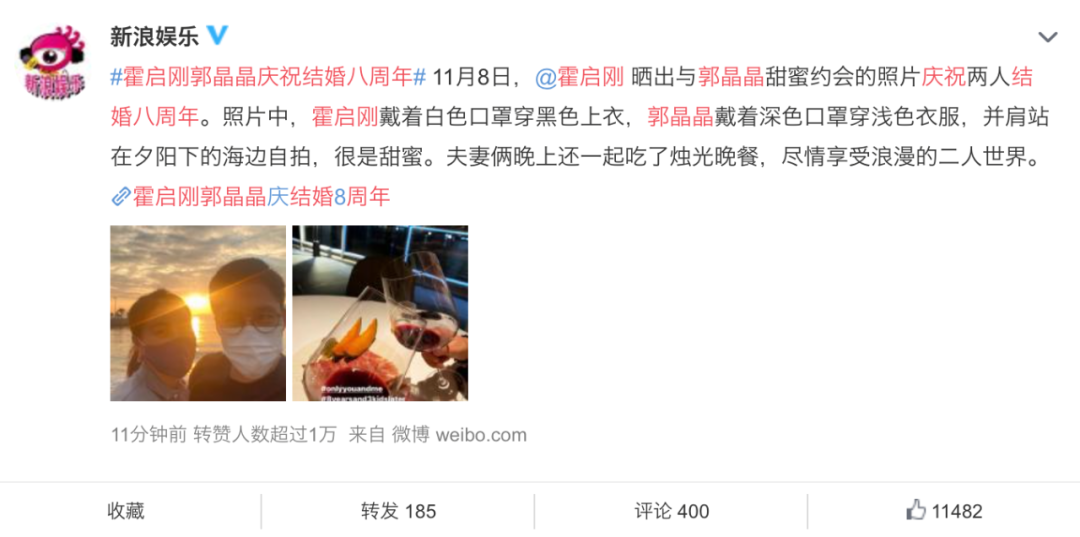 八周年的纪念日11月8日,霍启刚为了庆祝与郭晶晶结婚八周年的纪念日,特意在社交平台上晒出了两人在夕阳前的纪念美照。
