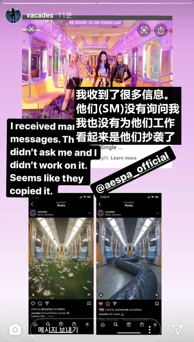vacades是德国著名视觉艺术家,他本人常常在INS上传自己制作的概念视频。此次aespa出道曲MV预告公开后,vacades通过INS STORY表示自己收到了大量私信,网友提醒他表示aespa的预告涉嫌抄袭他的概念,所以他发文艾特aespa官方,希望官方能给予说法。