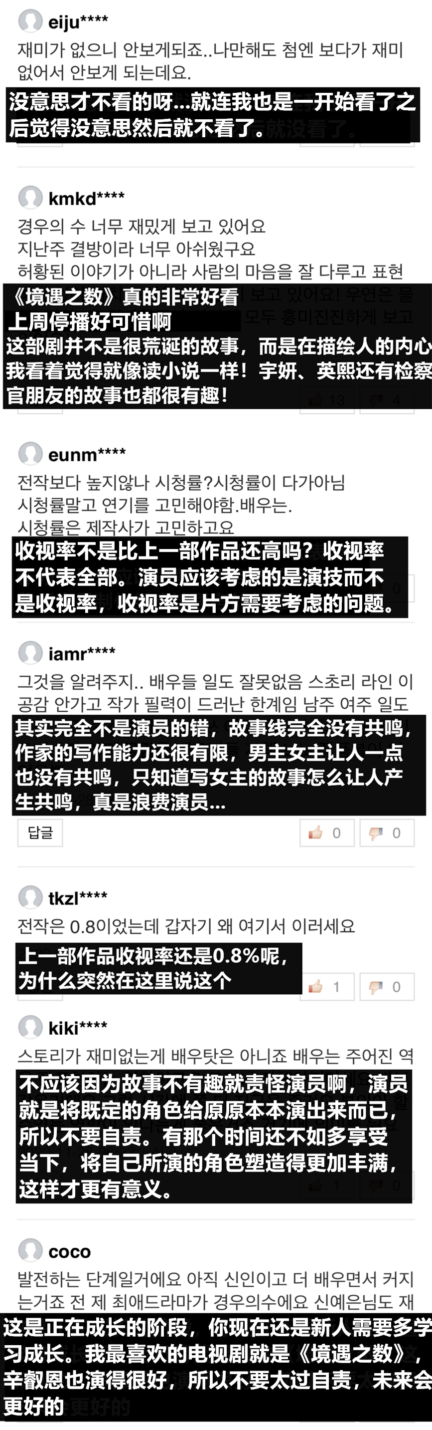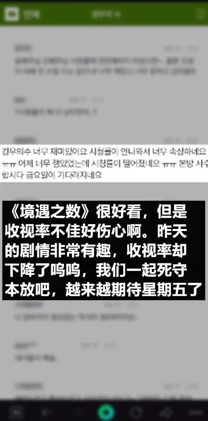 同时她还看到某位观众留言表示:“《境遇之数》很好看,但是收视率不佳好伤心啊。昨天的剧情非常有趣,收视率却下降了呜呜,我们一起死守本放吧,越来越期待星期五了”。