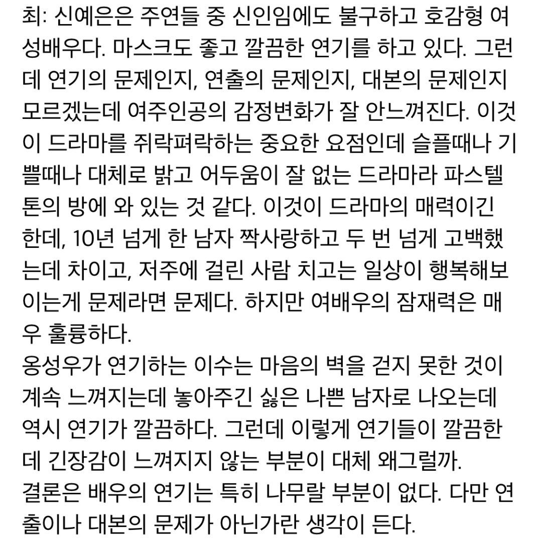 崔英日大众文化评论家:辛叡恩在主演中虽然是新人,但却是好感型女演员。长相不错演技干净利落。但是我不知道是表演的问题,还是导演、剧本的问题,我感受不到女主角的感情变化。无论是悲伤还是高兴都是电视剧的关键要素,但这部电视剧既不明亮也不黑暗,就像是来到了一个柔和的房间里一样。不过这也是电视剧的魅力所在,单恋一个男人10多年,告白两次以上都被拒绝,对于被困在诅咒里的人来说,日常看起来很幸福的话那就更有问题了。因此女演员的潜力还是不错的。邕圣祐饰演的李修,我感觉他一直没能走出自己的心墙,是一个不愿意放手的坏男人,邕圣祐的演技也挺干净利落。但演技如此干净利落,剧情却让人感觉不到紧张感,到底是为什么呢?结论是演员的表演没有特别需要挑剔的地方,只是觉得这或许是导演或剧本的问题。看了专家的评论和分析后,网友们也纷纷表示很有共鸣,希望该部剧的导演编剧能有所改进。