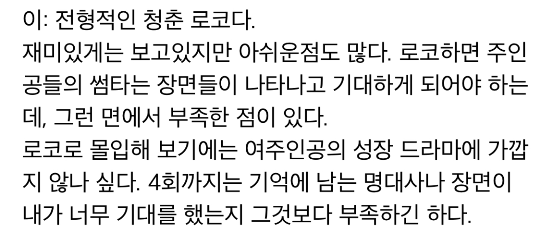 李教授:《境遇之数》可以说是很典型的浪漫喜剧(roco)。虽然看起来很有趣,但也有很多可惜之处。提到浪漫喜剧观众们通常会很期待电视剧里主人公们的暧昧场面,不过这方面有些欠缺。虽然这是一部浪漫喜剧,但看的时候会不会觉得这更像是女主人公的成长电视剧。目前我看了前4集,但是没有出现我非常印象深刻的名台词或者名场面,所以我认为还是有不足之处。