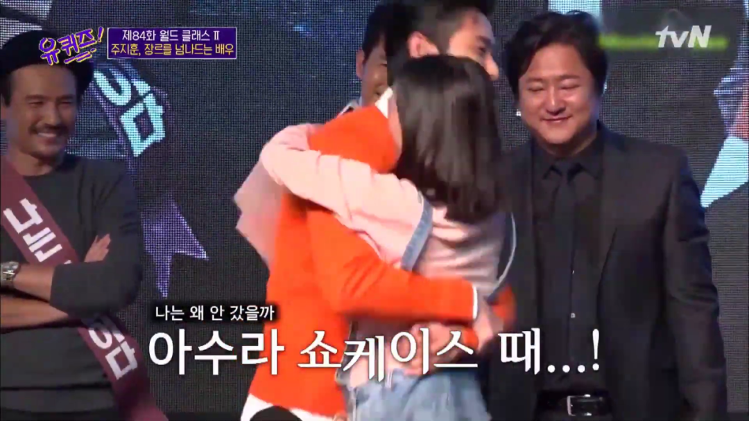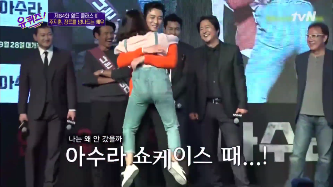 因为朱智勋既演过非常善良的角色,也演过非常恶毒的角色,所以不少粉丝称赞他有种善与恶共存的魅力!对此朱智勋表示:因为我是大小眼,当导演们需要我演非常冷酷的戏份时我会多活用小的这个眼睛,当需要演比较温和的戏份时就用大的这个眼睛。事实上一开始做演员的时候我听别人说“大小眼当不了演员”“个子太高当不了演员”“太黑当不了演员”...但我好像就是以这三点特质成为演员的。另外主持人刘在石还提到朱智勋曾在电影《阿修罗》的发布会上进行过破格的粉丝服务。当时他不仅抱了粉丝,还把粉丝抱起来转了一圈,发布会现场的其他演员也感到非常惊讶。对此朱智勋解释了当时的情况:我其实是从雨盛哥那里学来的。因为我不管是去电影节走红毯还是干嘛,大家好像都觉得我是在摆臭架子。但是雨盛哥走红毯的时候就很引人注目,他会一直回应大众。所以有一次我就问了他“我们其实很感谢观众,但该怎么做呢”?《阿修罗》发布会时我想的是拥抱一下小粉丝作为粉丝服务,但是因为抱一下时间很短,我就想再多做一会粉丝服务,然后就抱起那位小粉丝转了一圈,真的很对不起。