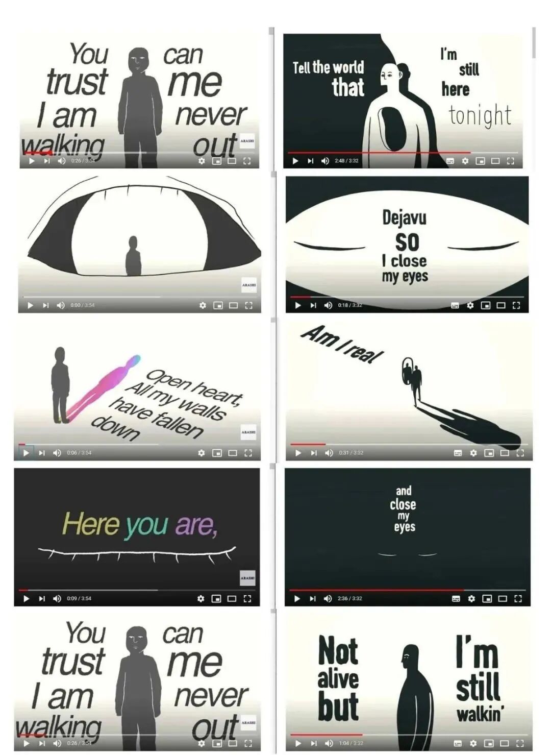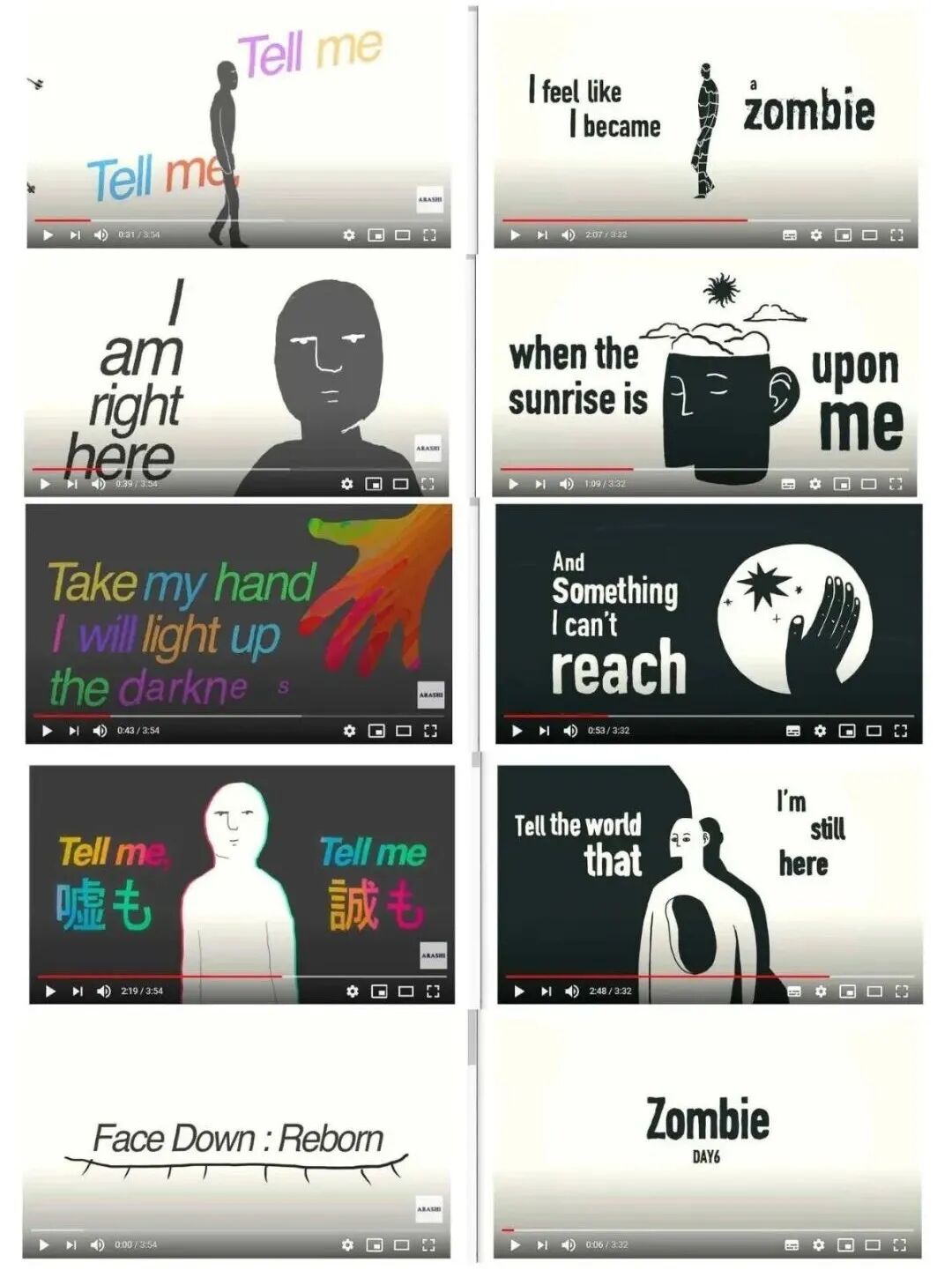 帖主将岚的《Face Down:Reborn》歌词版MV与Day6《Zombie》歌词版MV进行了截图对比,如下图可见两者画面真的非常相似。