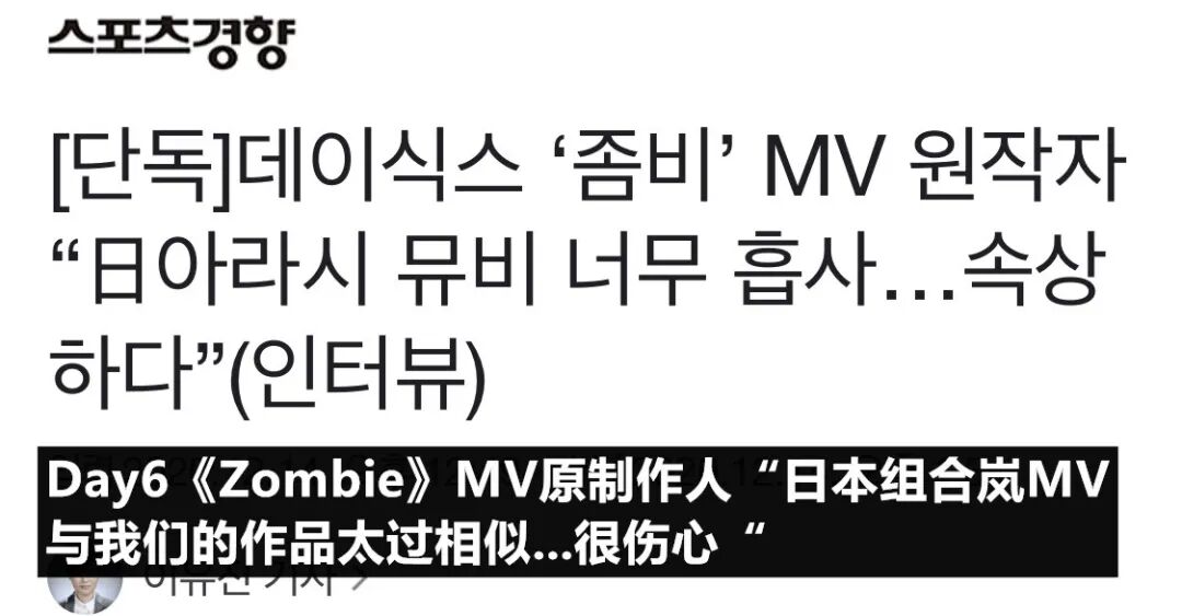 同时今日下午Day6《Zombie》歌词版MV的制作人通过媒体对相关争议发表了立场:今年6月我从海外粉丝那里收到了两个MV相似的消息,因为两个MV太过相似所以让我感到很惊讶,但是也只能安慰自己是我们的MV制作得太好,所以连日本国民偶像都会模仿我们。
